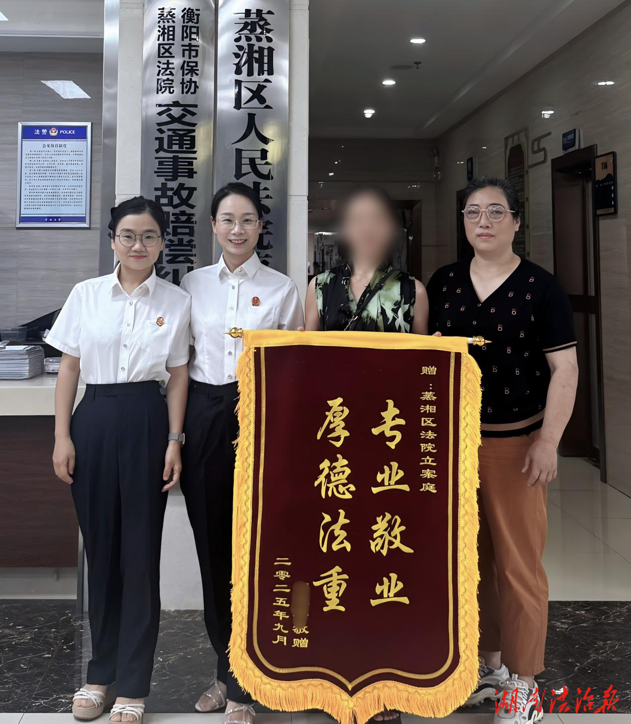 湖南法治報(bào)訊(通訊員 李昱臻)近日,衡陽(yáng)市蒸湘區(qū)人民法院立案庭法官成功調(diào)解一起工傷死亡遺產(chǎn)繼承糾紛,通過(guò)釋法明理和溫情調(diào)解,獲得了當(dāng)事人劉某送來(lái)的“厚德法重,專業(yè)敬業(yè)”錦旗致謝。