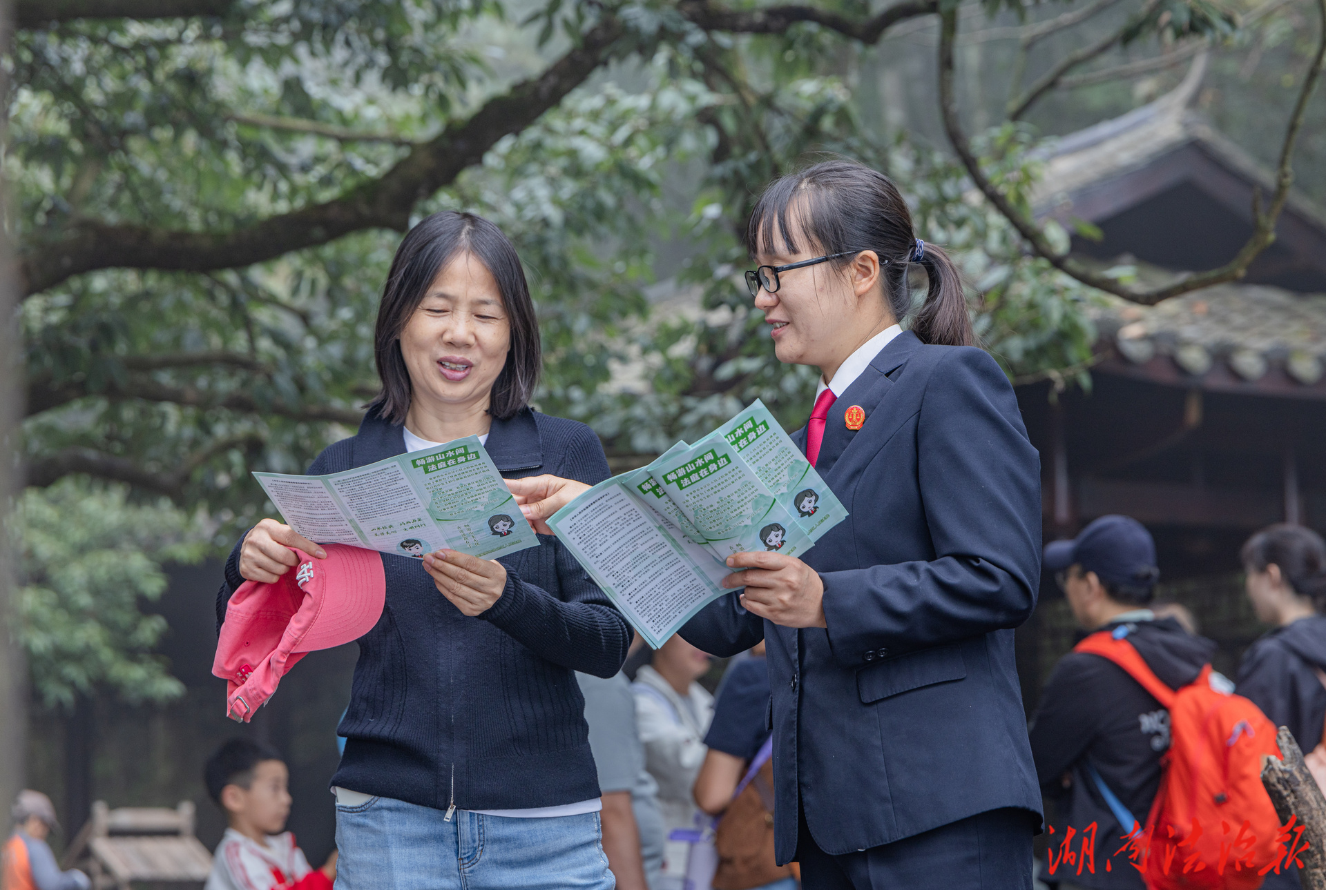 “您好!我是永定區(qū)法院旅游速裁法庭的工作人員,如果您在旅游過程中合法權(quán)益受到損害,可隨時撥打法官熱線,我們 24 小時在線提供法律服務(wù)!” 在值班服務(wù)點,旅游速裁法庭干警主動向過往游客遞上法律宣傳資料,耐心介紹道。