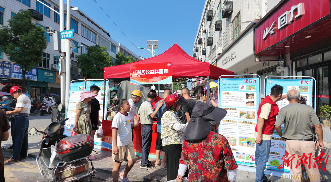 從電器商城出來,集市十字路口的紅背包公益鋪?zhàn)釉缫褵狒[非凡。穿紅馬甲的志愿者舉著小禮品吆喝:參加學(xué)習(xí)領(lǐng)品咯!” 路人不斷公益鋪?zhàn)拥臄偽唬?/span>聽志愿者用示意圖講滑坡前兆。“原來山坡掉石頭不是小事,這本冊(cè)子帶讓兒子也學(xué)學(xué)。領(lǐng)到宣傳冊(cè)和小禮品的大叔一邊自言自語一邊擠出人群。還有志愿者剛領(lǐng)著圍觀的群眾在一邊的科普展架前直接開講,“馬路課堂”一時(shí)熱鬧非凡。