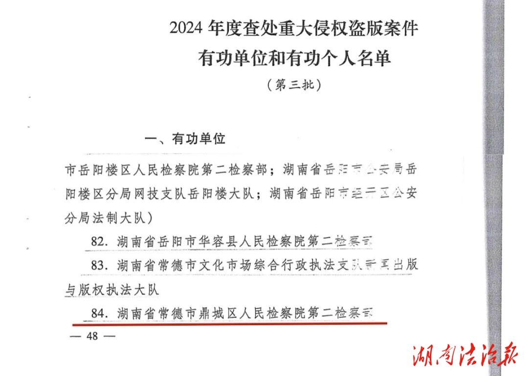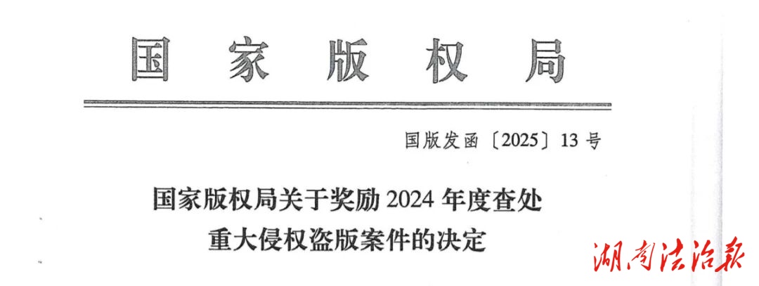近日,國家版權(quán)局發(fā)布《國家版權(quán)局關(guān)于獎(jiǎng)勵(lì)2024年度查處重大侵權(quán)盜版案件的決定》,對(duì)2024年度查處重大侵權(quán)盜版案件有功單位和有功個(gè)人給予獎(jiǎng)勵(lì)。其中,湖南省常德市鼎城區(qū)人民檢察院1個(gè)集體獲評(píng)有功單位,2名個(gè)人獲評(píng)有功個(gè)人。