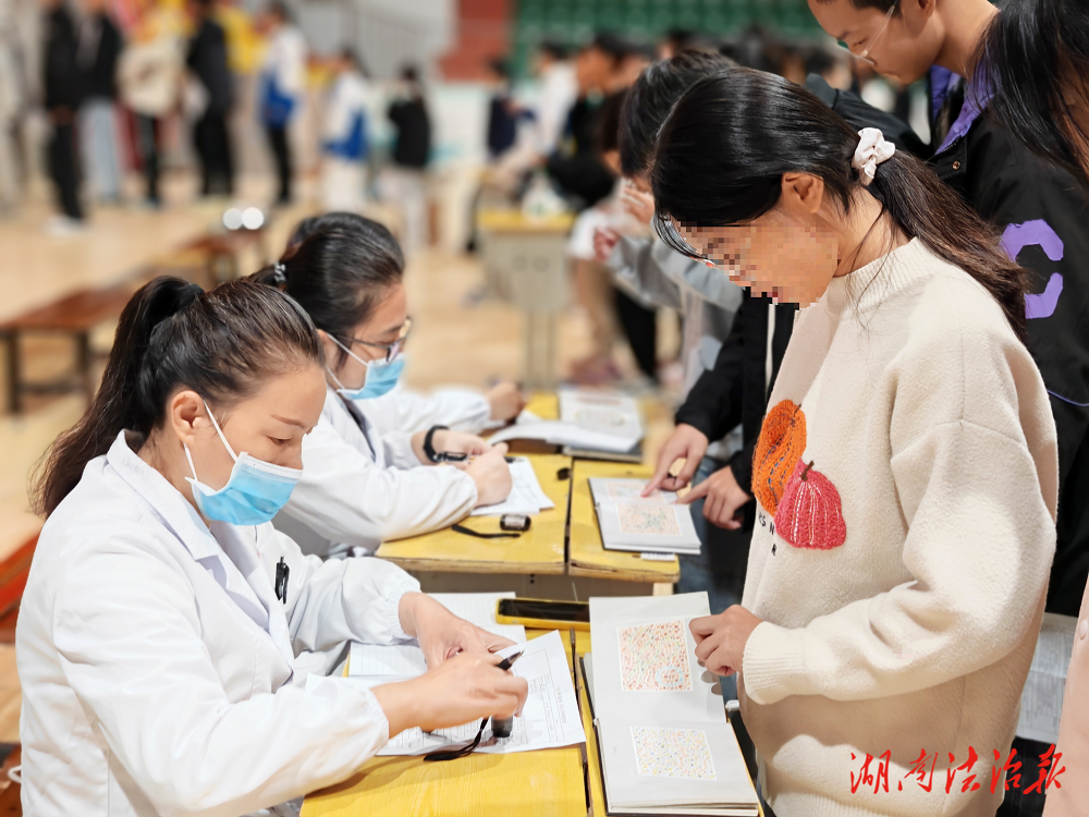 “你的體重偏重了,平時要注意控制飲食,少油少糖,多參加體育鍛煉?!爆F(xiàn)場的醫(yī)務人員認真細致地為每一位學生進行檢查,耐心解答同學們的疑問,并在檢查過程中適時開展健康宣教,提醒同學們注意用眼衛(wèi)生、合理膳食、加強鍛煉。