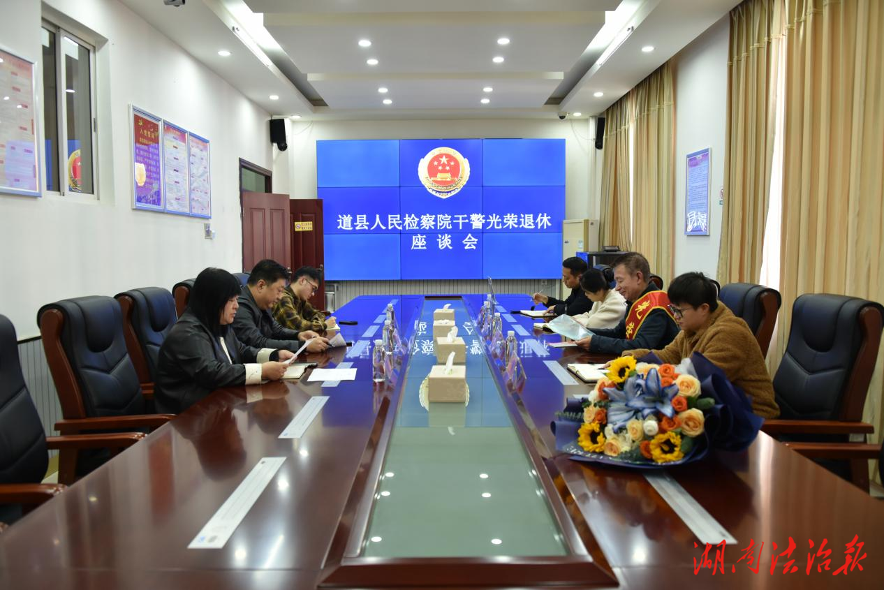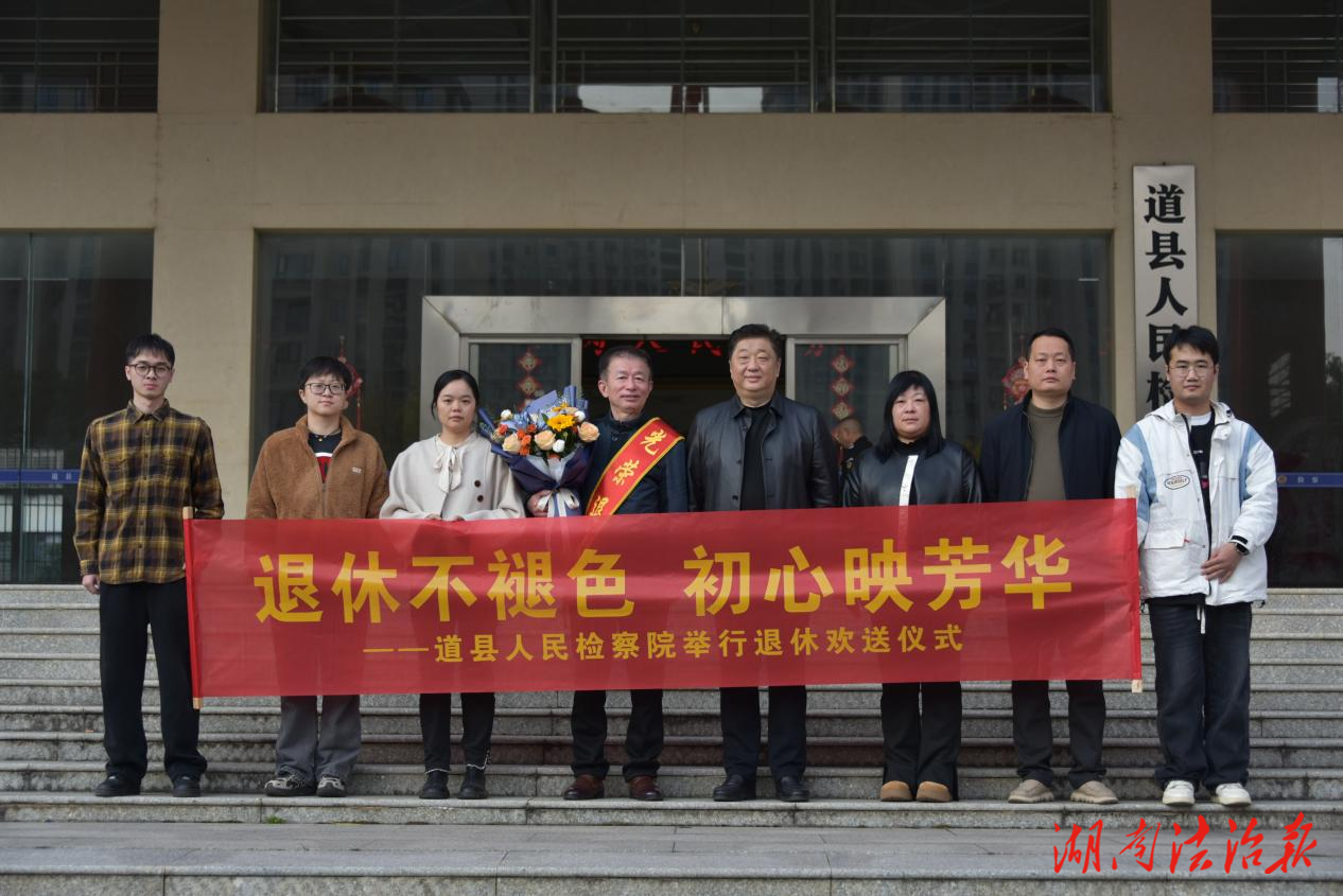 湖南法治報訊(通訊員 劉闊)12月8日,道縣人民檢察院舉行干警光榮退休儀式,黨組書記、檢察長曲軍出席并講話,政治部主任戚涓主持儀式。副檢察長劉婷、刑檢部門主任尹俊及部分青年干警參加了儀式。