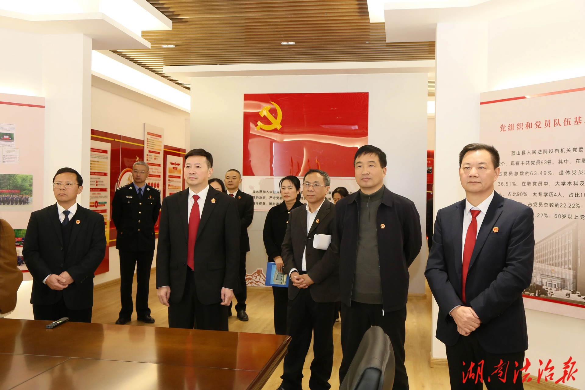 調(diào)研組一行先后參觀了藍山法院一站式訴訟服務中心、調(diào)解工作室、信訪接待室、黨建文化中心、廉潔文化長廊、代表委員之家等場所,詳細了解該院矛盾糾紛多元化解、黨建與業(yè)務深度融合、法治文化特色項目、廉潔司法建設等工作情況。